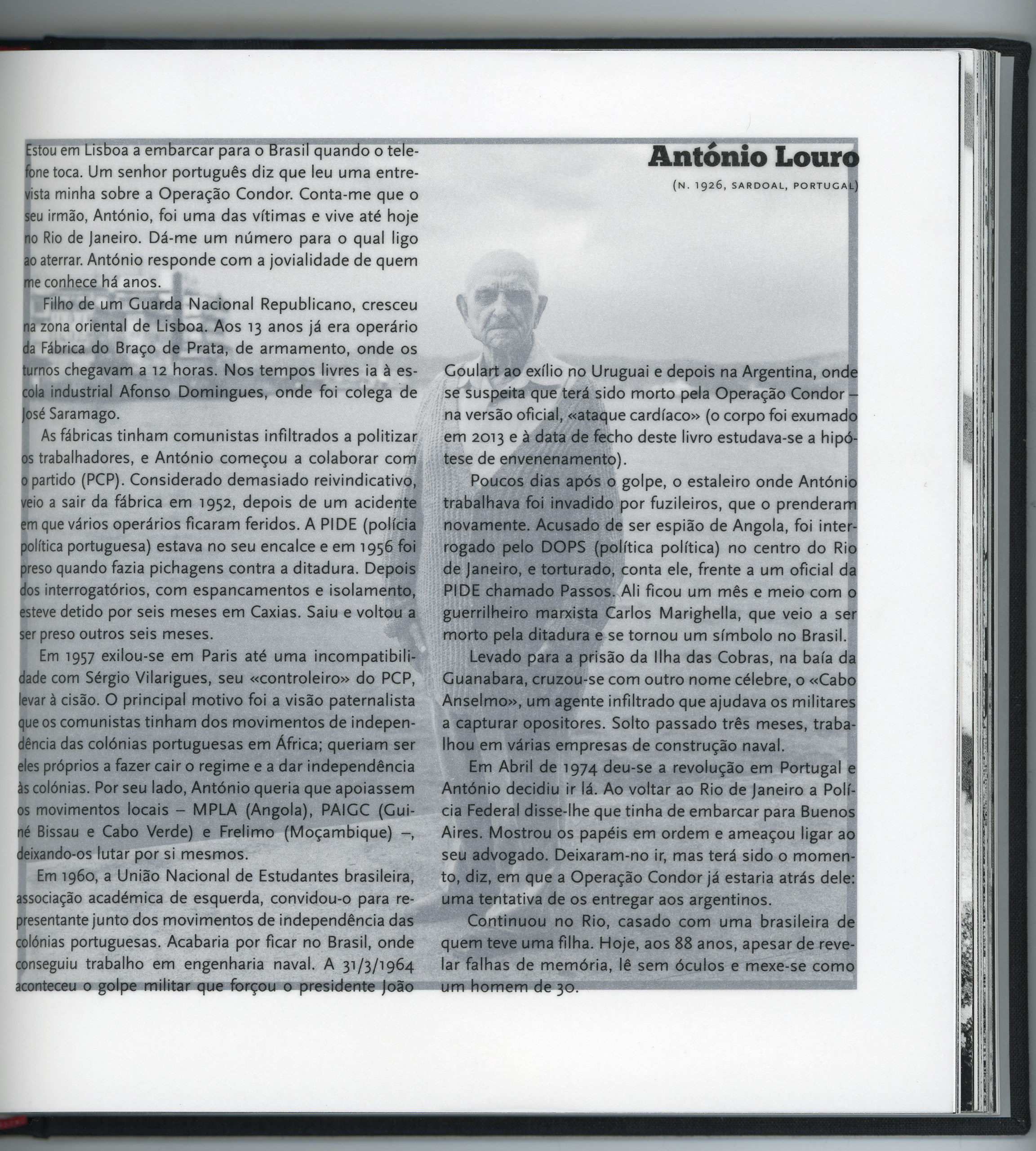 Esta historia que para nosotros es tristemente cercana no lo era para el fotógrafo Joao Piña, nacido en Portugal, quien trabajando en su primer libro que documentaba la historia de presos políticos de su país se interesó por la historia de la Operación Cóndor y decidió realizar esta investigación foto documental durante casi 10 años, recorriendo varios países de Sudamérica y entrevistando a víctimas de la represión militar e incluso a victimarios. El resultado es un contundente libro que intercala imágenes de archivo, retratos e imágenes de lugares en donde ocurrieron violentos hechos perpetrados por policías y militares, junto con textos con relatos de los entrevistados.